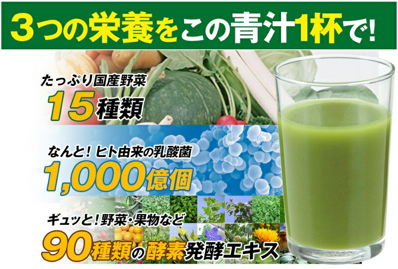 熊本産の大麦若葉、ケールなど国産野菜を15種類、ヒト由来の乳酸菌を1000億個配合。